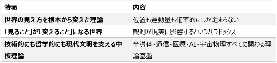 - 量子力学は、電子・光子・スピン・場などの自然の最小単位の振る舞いを正確に記述できる唯一の理論体系。
